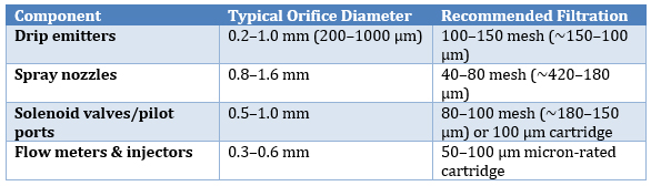 Rule of thumb: choose filter opening ≤ 1/10 of the smallest downstream orifice diameter: