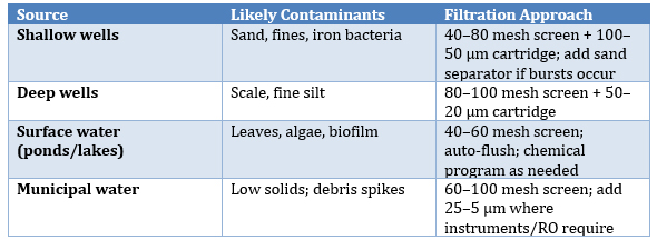 Aim for clean ΔP ≤ 1–2 psi across screens and ≤ 2–3 psi across cartridges at design flow. Trigger cleaning/changeout at ΔP = 5–7 psi.